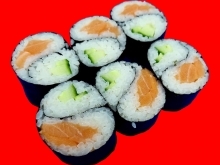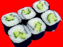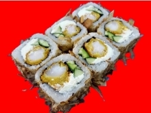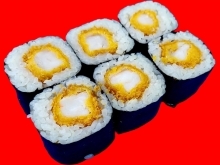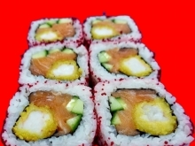Рис, огурец, креветка в кляре, лосось, икра масаго