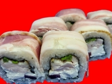 Рис, сыр, огурец, жаренный лосось, стружка тунца, терияки соус