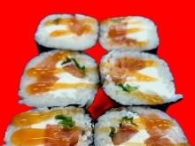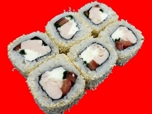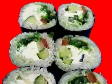 Рис, сыр, огурец, жаренный лосось,крем-краб, икра масаго