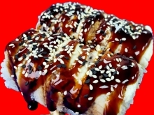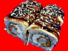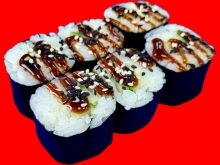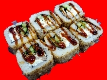Рис, крем-краб, угорь, унаги соус, кунжут