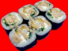 Рис, сыр, огурец, водоросли чука, креветка в кляре, ореховый соус