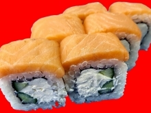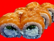 Рис , сыр, огурец, жаренный лосось, терияки соус, спайси соус