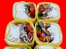 Тортилья, сыр, лук зеленый, болгарский перец, жаренный лосось