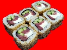 Рис, сыр, огурец, креветка в кляре, стружка тунца